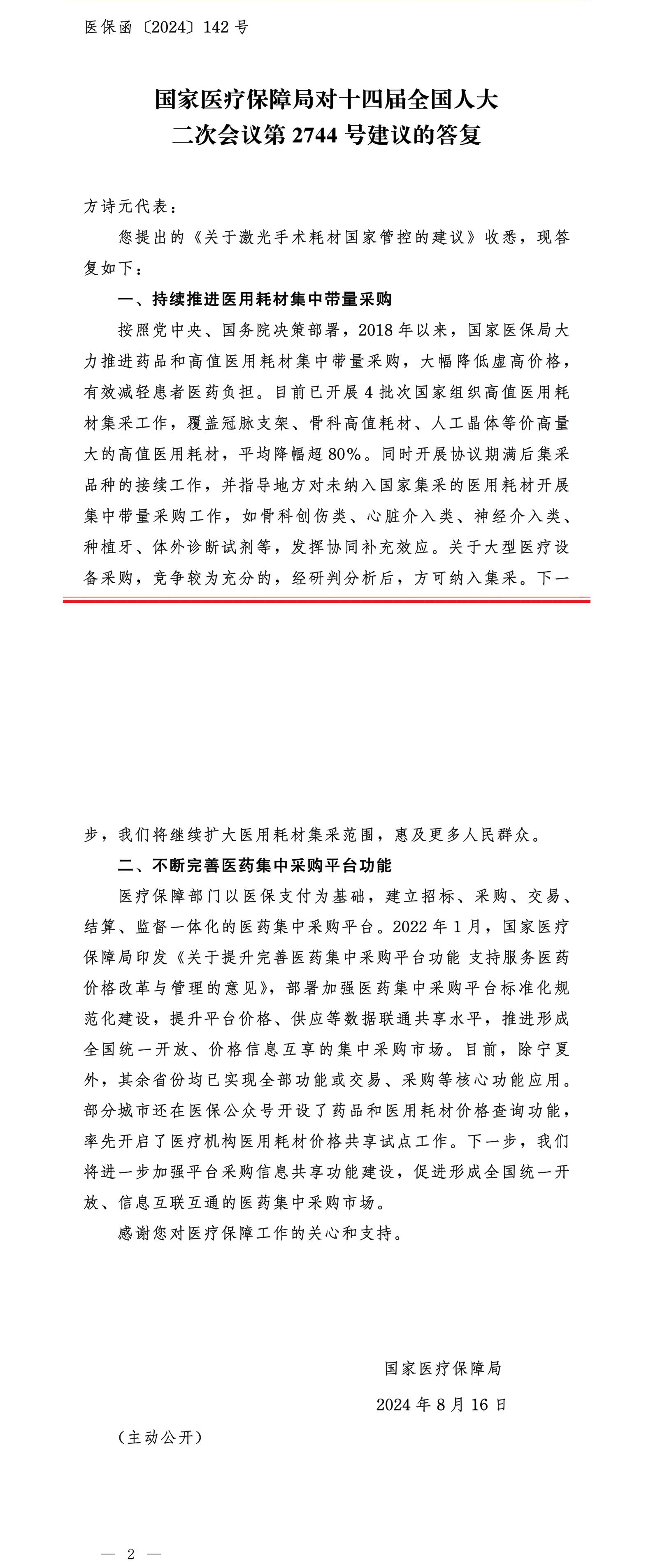 國家醫(yī)療保障局對十四屆全國人大二次會議第2744號建議的答復