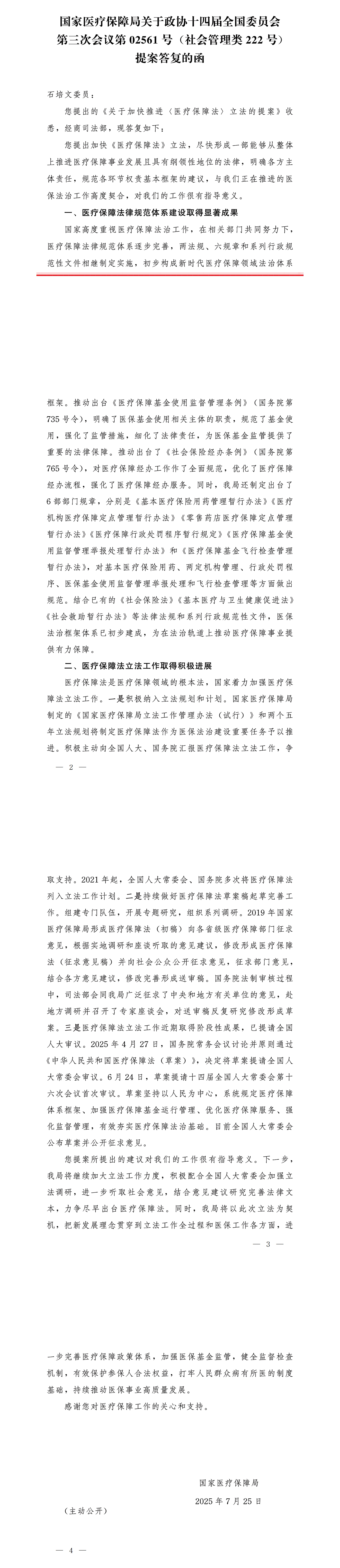 國家醫療保障局關于政協十四屆全國委員會第三次會議第02561號(社會管理類222號)提案答復的函